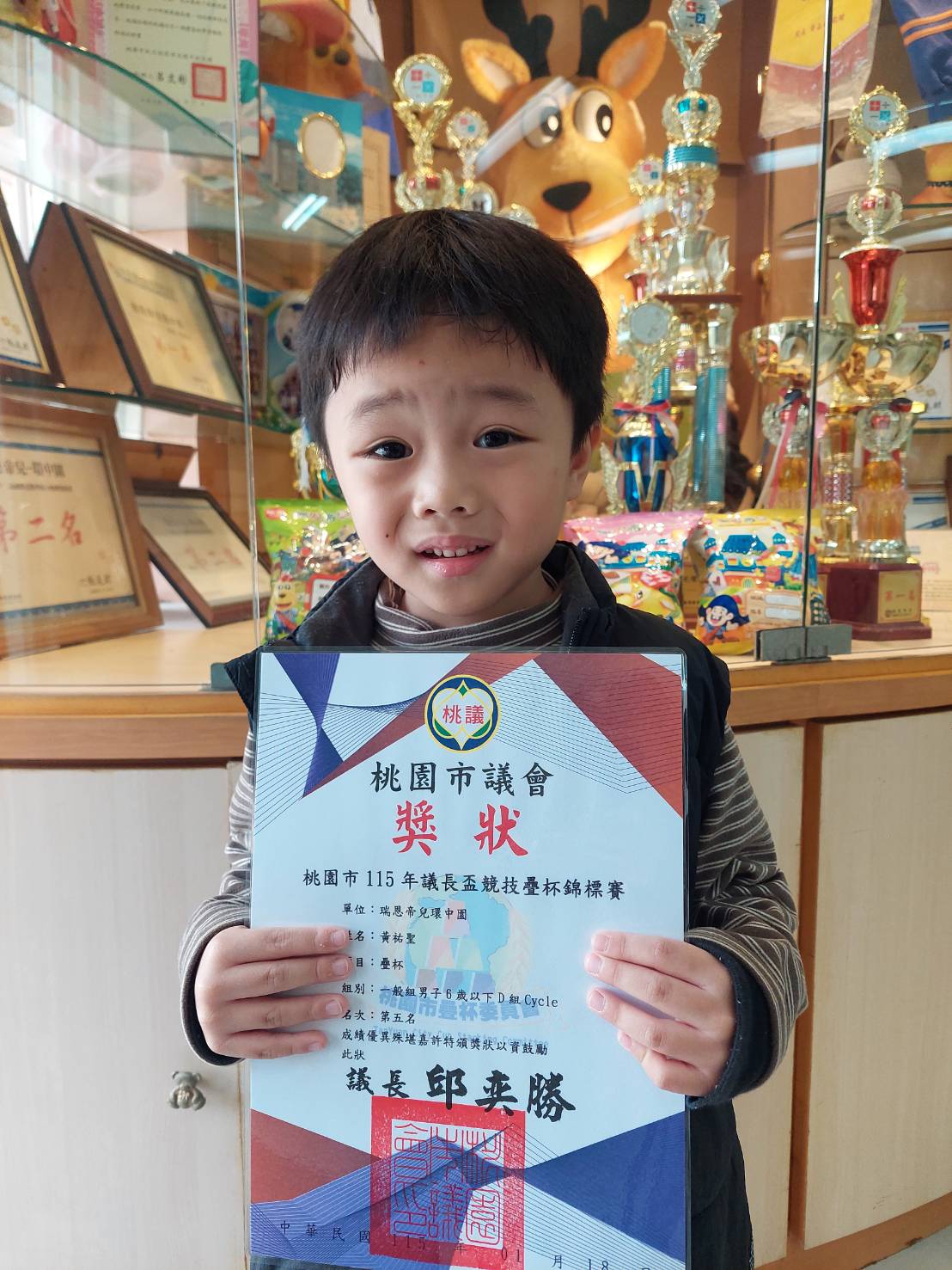 賀~滿天星班黃祐聖小朋友參加桃園市議長盃競技疊杯錦標賽表現優異!